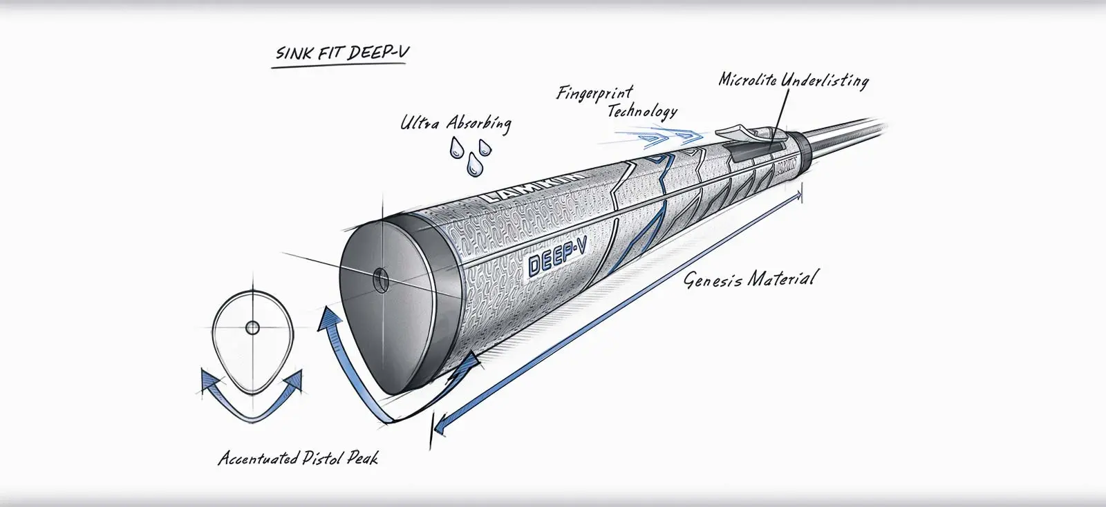 A two-part sleeved grip engineered with a lightweight under-listing compound, and our comfortably familiar-feeling rubber outer sleeve with Fingerprint Technology. By combining the two, we achieve the traction, durability, and feel of rubber, while providing the lightweight characteristics of polyurethane underlisting grips.