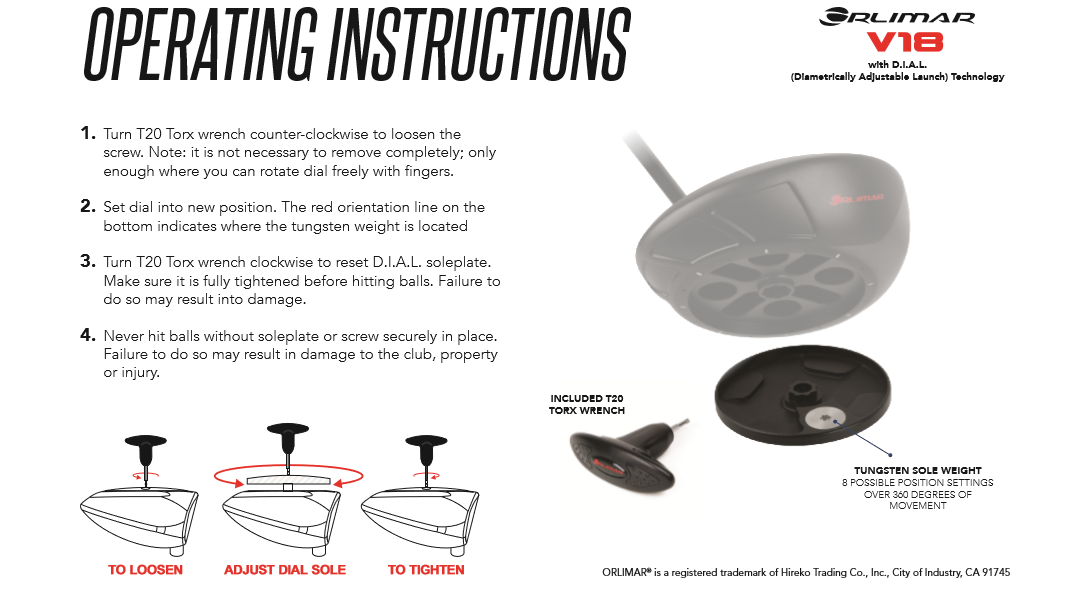 The Orlimar V18 driver comes with everything you need to fine-tune your game. As shipped, it will look like an ordinary driver as the soleplate and locking screw will be flush with the bottom of the sole.