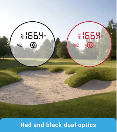 The PRO L1 provides the option of a Red or Black optical display meaning the optics are clear and visible in all light and weather conditions. Simply press the button to toggle between red or black when using the laser on the course. This customizable feature allows the golfer to use whatever is their personal preference.